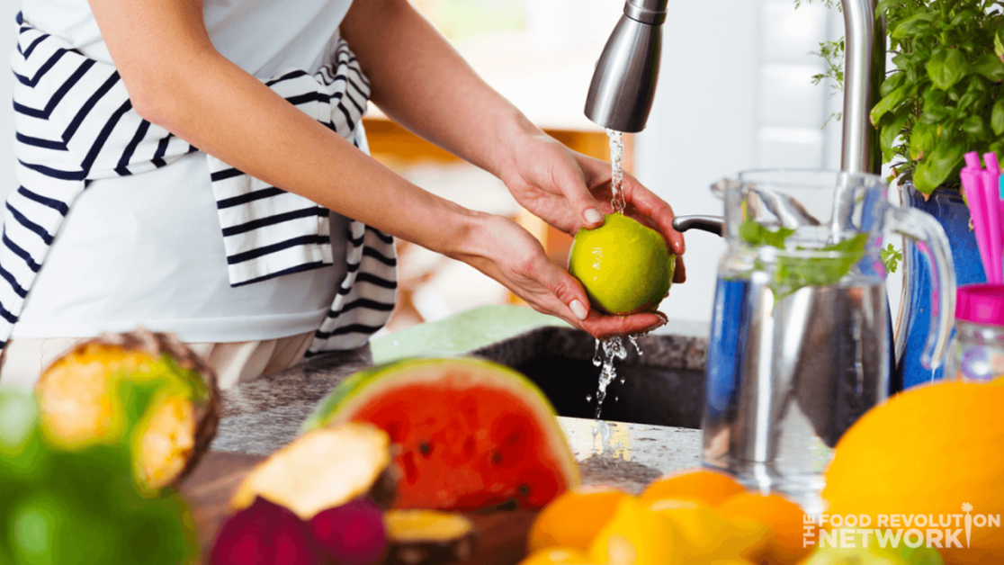 Aceasta e cea mai simplă și mai rapidă metodă. Ține fructele sau legumele sub apă rece de la robinet și freacă-le ușor cu mâinile. Întoarce-le pe toate părțile și spală-le până când nu mai vezi murdărie. Dacă ai legume sau fructe tari, cum ar fi cartofi, morcovi, mere sau pepene, folosește o perie de bucătărie curată și freacă bine coaja. Astfel, vei îndepărta murdăria și o mare parte din pesticidele de la suprafață. Cercetările spun că doar cu apă simplă putem scăpa de 50–80% dintre substanțele chimice de pe coajă.