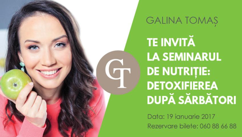 Doctorul în științe medicale vă invită la seminarul de nutriție "Detoxifierea după sărbători", care va avea loc pe 19 ianuarie. Galina Tomaș vă va ajuta să slăbiți și să adoptați un stil de viață sănătos.Începând cu luna ianuarie, nutriționista lansează o serie de seminare lunare, în cadrul cărora veți putea afla răspunsuri la toate întrebările legate de nutriție, mișcare, slăbire, dar cel mai important cum să găsiți motivația ca să aplicați toate cunoștințele în practică pentru a obține rezultatul dorit.La primul seminar, care va avea loc pe data de 19 ianuarie, Galina Tomaș vă va vorbi despre detoxifiere, pentru că este impetuos necesar să scăpați de toxinele și reziduurile alimentare acumulate de sărbători. Vă va recomanda câteva cure de detoxifiere, regulile pe care trebuie să le respectați dacă v-ați decis să țineți una din aceste cure, veți învăța pas cu pas cum se face corect o cură de detoxifiere.https://www.youtube.com/watch?v=ktPJ1BHTC6MSEMINARELE LUNARE ÎN DOMENIUL NUTRIȚIEI sunt NOI pe piața din Moldova, iar scopul lor este de a învăța oamenii să adopte un stil de viață sănătos, de a păstra și menține sănătatea, de a schimba modalitatea de gândire în materie de nutriție.