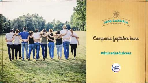 Moșul Zaharia are și el un suflet dulce. Ar vrea să ajute cât mai multă lume, dar nu are atâtea mâini și picioare.Haideți să-i dăm o mână de ajutor. Toată lumea este invitată să participe în campania de îndulcire a sufletelor #dulcedaidulceai.Că să meargă lucrurile, sunt niște pași de urmat:1. Fă o faptă bună. Îndulcește ziua și sufletul cuiva.2. Încarcă poza cu marea îndulcire pe facebook folosind hashtagul #dulcedaidulceai3. Îndeamnă prietenii să-ți urmeze exemplul.În caz că ești în pană de idei cum ai putea contribui, venim cu niște sugestii. Ai putea da mai departea buna dispoziție cu:-un gest frumos făcut pentru ai tăi;- un cadou surpriză făcut colegilor;- un ajutor pentru cineva necunoscut;- un buchet de flori dăruit la întâmplare;- un prânz oferit unui cerșetor;- o conversație în parc cu un om singuratic;- un video cu un muzician ce cântă în plină stradă;- o multitudine de alte posibilități de a îndulci sufletul cuiva;Să dăm sfoară-n țară ca să afle cât mai multă lume. Să îndulcim țara asta în lung și-n lat!Detalii pe www.moszaharia.md și facebook.com/MosZaharia/.https://www.youtube.com/watch?v=suEhDh5afJwZahărul „Moș Zaharia” este un produs al ICS “Moldova-Zahăr” SRL, confecționat din sfeclă de zahăr cultivată sută la sută în Moldova.Compania a fost achiziționată în mai 2011 de “Krajowa Spółka Cukrowa” S.A. - Asociația poloneză a producătorilor de zahăr. Compania nu doar că a reușit să revitalizeze fabrica practic distrusă, ci și să modernizeze cele mai bune tradiții moldovenești de producere.