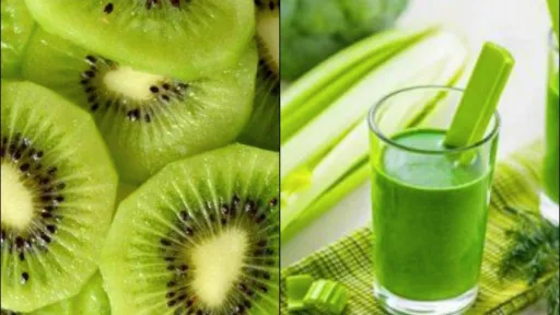 Amestecă, într-un blender, o tulpină de țelină cu un fruct de kiwi. Bea acest suc dimineața, pe stomacul gol, dacă nu ai probleme de stomac.Țelina, datorită conţinutului ridicat de apă şi fibre ajută la menţinerea siluetei. Pentru rezultate cât mai eficiente este indicat consumul regulat de frunze de ţelină sub formă de salate şi de suc obţinut din rădăcina telinei.Mai mult, țelina reglează nivelul tensiunii arteriale, reduce nivelul hormonilor de stres din organism. Dacă este consumată constant, ţelina reduce inflamaţiile articulaţiilor şi durerile provocate de artrită datorită proprietăţilor antiinflamatoare.Dacă ai probleme cu balonarea şi burta umflată, sucul de ţelină poate fi de ajutor.Frunzele de ţelină sunt bogate în vitamina A, iar tulpinile dispun în abudenţă de vitaminele B1, B2, B6, dar şi potasiu, calciu, fier, magneziu, sodiu şi fosfor. Țelina rehidratează organismul cu minerale, mai ales dacă sucul este consumat după un efort fizic prelungit.Cercetările au demonstrat că ţelina scade colesterolul ,,rău”, reduce inflamațiile în caz de guţă, astm, bronşite sau alte afecţiuni respiratorii.De asemenea, menţine activitatea normală a rinichilor şi contribuie la eliminarea toxinelor din organism.