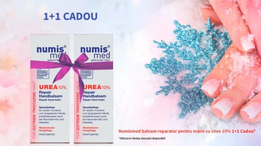 O piele frumoasă, sănătoasă şi cât mai tânără, este ceva ce își dorește orice femeie.Numismed Balsam reparator pentru mâini, cu Uree 10%, oferă îngrijire eficientă, hidratare intensă și protecție sigură pentru pielea mâinilor în sezonul de iarnă.Atenție! Doar acum! La procurarea unui Balsam reparator pentru mâini cu Uree 10% Numismed se oferă cadou unul gratis. Grăbește-te! Ofeta este valabilă în limita stocului disponibil.Surprizele nu se termină aici!La procurarea unei loțiuni intime Numismed Ph 4,2 se oferă reducere de 40% la al doilea produs. Nu rata promoțiile! Produsele Numismed le găsești în toate farmaciile ,,,Farmacia Familiei”.