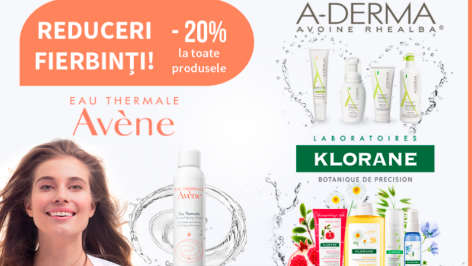 Acum ai șansa să achiziționezi produse de înaltă calitate, la cel mai bun preț. Produse pentru îngrijirea corpului, părului, creme pentru față, șamponuri, loțiuni demachiante, balsamuri etc. - ultimele zile de vară îți aduc reduceri fierbinți la toată gama de produse Avene, Klorane, Elancyl, A-Derma.