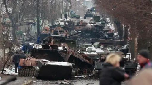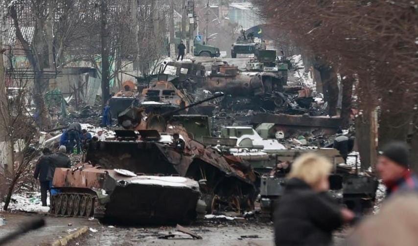 Au trecut şapte zile de când Rusia a început invazia Ucrainei, iar în oraşul Bucha, situat în apropiere de Kiev, s-au dat lupte grele. Pe reţelele de socializare au fost publicate imagini cu dezastrul lăsat în urmă, inclusiv fotografii cu ceea ce pare a fi un munte de blindate ruseşti, în ruină, abandonate pe străzi.