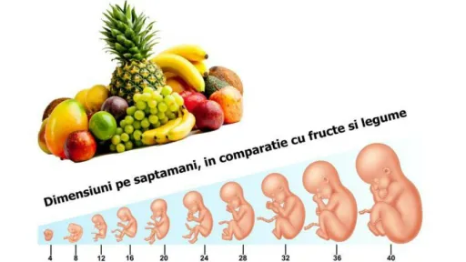 Bebe e de mărimea unei semințe de mac. Cam de pe-acum, sarcina poate fi detectată cu un test făcut acasă.5 săptămâni:Bebe e de dimensiunea unei semințe de susan. În continuare fătul este foarte mic, însa de-aici încolo dezvoltarea va fi progresivă.6 săptămâni:Bebe e de dimensiunea unei semințe de linte.7 săptămâni:Fătul e mare cât o afină.8 săptămâni:Bebelușul ajunge la dimensiunea unei boabe de fasole.9 săptămâni:Bebe e de dimensiunea unei boabe de strugure alb. Ochișorii ii sunt complet formați, însa pleoapele vor rămâne închise până în săptămâna a 27-a.10 săptămâni:Bebe este cât o corcodușă coaptă. La 10 săptămâni, bebelușul cântărește mai puțin de 7.5 grame și are cam 3 cm lungime.11 săptămâni:Bebe a ajuns la dimensiunea unei smochine coapte. Are puțin peste 4 cm în lungime și e încă foarte micuț. Deja se mișcă și se întinde, însa nu vei simți mișcările pentru încă o lună.12 săptămâni:Bebe e cât un lime. Bebelușul are acum cam 5 cm lungime și cântărește cca 15 grame.13 săptămâni:Bebe e cțt o păstaie. Are aproape 30 de grame și cam 7,5 cm în lungime.14 săptămâni:Bebe e cât o lămâie, ca dimensiuni. Deja are mimică facială, poate urina și în unele cazuri își poate suge degetul.15 săptămâni:Bebe e cât un măr. Cântărește aproximativ 75 de grame deja și are 10 cm în lungime.16 săptămâni:Bebe e căt un fruct de avocado. La 16 săptămâni, fătul atinge pragul de 100 de grame și 12 cm lungime.17 săptămâni:Bebe are dimensiunea unei țeline de primăvară cu frunze. Desigur, dacă iei în calcul doar partea rădăcinoasă, nu și frunzele.18 săptămâni:Bebe e cat un ardei grasDaca urmeaza sa ai o fetita, uterul si trompele uterine i se formeaza in aceasta saptamana.Daca urmeaza sa ai baiat, organele lui genitale nu sunt inca vizibile, deci la ecografie e posibil sa ti se spuna ca ai fata.19 săptămâni:Bebe e de dimensiunea unei roșii de grădină. Acest lucru înseamnă că a ajuns la cca 250 de grame și 15 cm lungime.20 săptămâni:Bebe are acum dimensiunea unei banane medii.21 săptămâni:Bebe e lung cât un morcov de dimensiuni medii.22 săptămâni:Bebe este acum cât un dovlecel.23 săptămâni:Fătul a ajuns la dimensiunea unui mango mare. Dacă pui muzica și începi să dansezi, te poate simți.24 săptămâni:Bebe e lung cât un știulete de porumb. Din cap până în picioare, bebe are cca 30 de cm și cântărește cca 650 de grame.25 săptămâni:Bebe are acum dimensiunea unei sfecle roșii mari. În această săptămână bebe poate ajunge la cca 700 de grame și are 33 cm lungime.26 săptămâni:Fătul are deja lungimea unei legături de ceapă. Deja îți poate auzi vocea ta și ocazional pe a celor din jur.27 săptămâni:Bebe e cât o conopidă mică. Cântărește deja cca 900 de grame și măsoară 36 de cm în lungime.28 săptămâni:Bebe e cât o vânătă mare. Cântărește aproximativ 1100 de grame, are 38 de cm lungime și poate deja să clipească.29 săptămâni:Bebe e cât un dovleac plăcintar. În această săptămână poate ajunge la 1150 g și are puțin peste 38 de cm.30 săptămâni:Bebe e de dimensiunea unei verze mici. Depășește pragul de 1300 g și e lung de aproape 40 de cm.31 săptămâni:Bebe e de dimensiunea unei nuci de cocos mare.32 săptămâni:Bebe e cât un pepene galben mic. Începe să ocupe tot mai mult loc în uter și trece de pragul de 1,5 kg.33 săptămâni:Bebe atinge dimensiunile unui ananas. În această perioadă, oasele încep să se întărească și capătă tot mai mult aspectul de bebeluș.34 săptămâni:Bebe e căt un pepene galben mediu. În această săptămână atinge deja 2 kg în greutate și e lung de 45 de cm.35 săptămâni:Bebe e cât un pepene verde mic. Deja nu prea mai are loc în uter, deoarece pe măsură ce trec săptămânile își mărește progresiv greutatea și lungimea.36 săptămâni:Bebe e lung cât o salată cu frunze lungi. Are deja cca 2700 g și greutatea lui crește cu cca 30 g pe zi.37 săptămâni:Bebe e lung cât o legătura zdravănă de stevie târzie. Măsoara deja mai bine de 48 de cm.38 săptămâni:Bebe e lung cat o legătură de praz. Are puțin peste 3 kg și are lungimea de cca 50 cm.39 săptămâni:Bebelușul ajunge la dimensiunile unui pepene mediu, cântărește puțin peste 3 kg și trece de 50 de cm.40 săptămâni:Bebe e de dimensiunea unui dovleac mic de halloween. Din acest moment, bebelușul se poate naște oricând. El poate cântări în medie 3,5 kg și ca lungime medie va avea în jur de 51 cm.
