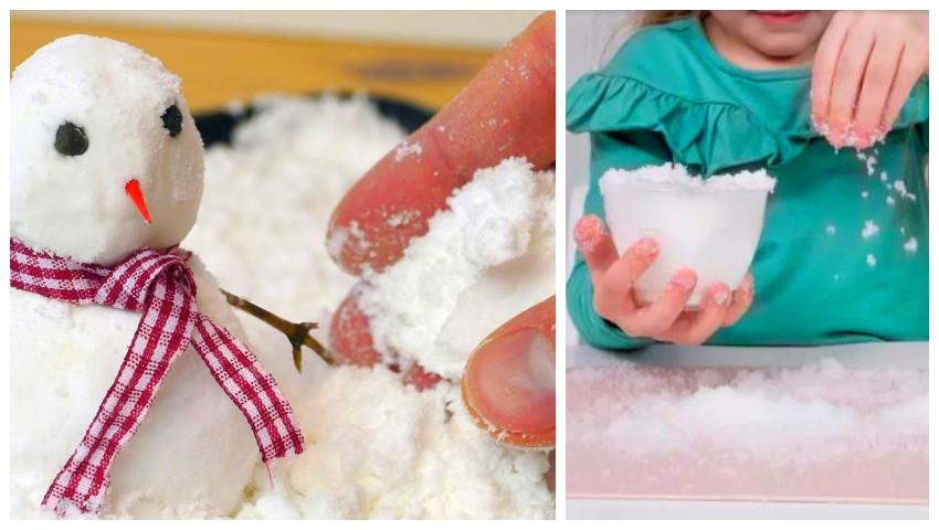 Descoperă cinci rețete simple să faci zăpadă artificială, pufoasă și rezistentă, cu care poți decora bradul, globulețele și toate podoabele de Crăciun.