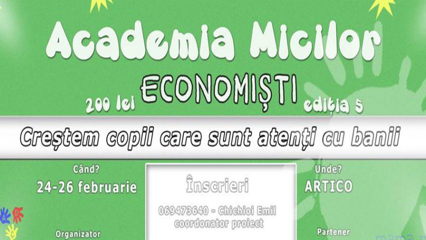În perioada 24 – 26 februarie, A.O. „Alături de copii” organizează „Academia Micilor Economiști”, cu tematica „Educație economică pentru copii - Valoarea banilor și gestiunea eficientă a acestora”.Astfel, părinții doritori de a crește un copil care să fie atent cu banii, îl pot înscrie pe cel mic la acest proiect.