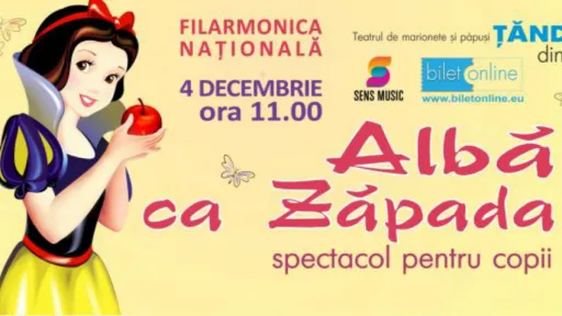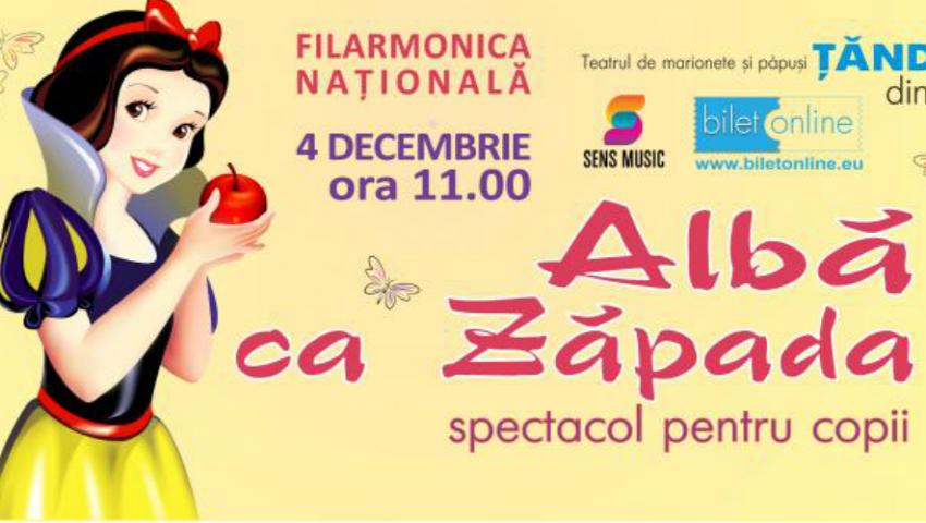 Povestea Albă ca Zăpada este dintre cele mai iubite de către micuţi. Cu toate că există mai multe variante în Europa, cea mai populară rămâne cea a Fraţilor Grimm. Teatrul de marionete şi păpuşi Ţăndărică, din Bucureşti, prezintă la Chişinău spectacolul Albă ca Zăpada, într-o regie cu totul fascinantă şi captivantă.