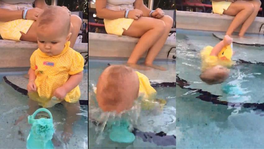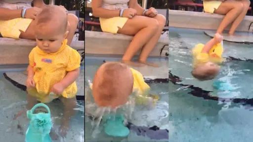 Copilul aşezat pe marginea unui bazin de înot doreşte să apuce un obiect care plutește în fața sa, însă cade şi se rostogoleşte în apă. După câteva secunde în care a stat cu faţa în jos , fetiţa se întoarce şi încearcă să-şi menţină corpul pe linia de plutire ca să nu se scufunde, înotând şi mişcând energic braţele şi picioruşele.