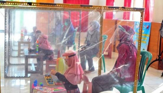 În timp ce şcolile din Indonezia încearcă să ţină cursuri online, o grădiniţă de pe insula Java îi readuce pe copii în clasă folosind cubicule transparente pentru a păstra distanţarea socială, scrie Reuters.