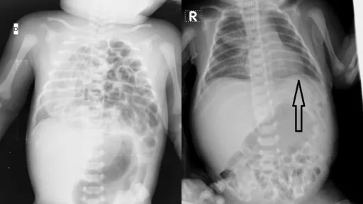 Înainte de operație: se observă toate ansele intestinului prezente în cutia toracică a bebelușului.