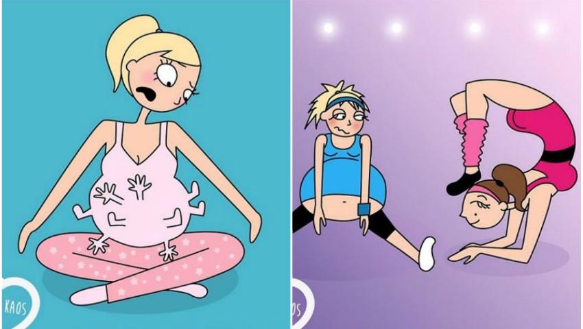 E posibil ca unele mămici să experimenteze unele din trăirile expuse mai jos, iar altele să nu se confrunte cu acestea. Prin urmare, tratați cu umor colecția de ilustrații pe care Line a denumit-o ,,Îmbrățișări și haos”.1. Îți dai seama că eșți în al treilea trimestru al sarcinii, când îți cad lucrurile pe jos și pleci înjurând pentru că nu ajungi să le ridici.2. Îți este foarte greu să te mai descurci cu regiunea de sub burtică.3. Cum te simți și cum crezi că te percep ceilalți în al treilea trimestru de sarcina...4. "Nu vreau să-mi mai atingeți burtică!", le spui prietenelor tale care vor să-ți atingă burtică în fiecare zi, săptămâna, luna.5. Urmele de vergeturi te fac să semeni cu o tigroaică.6. Cea mai mare teamă a bărbaților: "Mi-am lovit copilul!"7. Exercițiile fizice pe care le mai poți face în timpul sarcinii.9. Ai impresia că interiorul burticii tale este un câmp de luptă.10. Timpul pentru o nouă provocare. În aceste momente, ai vrea să ai picioarele mai scurte sau să mergi desculță.11. Sarcina și deliciile ei. Pofte, pofte și iar pofte!13. Momentul acela când soțul te susține 100% și vrea să se pună în locul tău.14. Una dintre marile temeri: să ți se rupă apă în public!15. Prințesă pernelor! "Nu sunt suficiente perne, mai vreau una!"17. Te simiti atât de umflată încât crezi că începi să semeni cu mascotă de la Michelin. 20. "Adori" să te trezești în toiul nopții din cauza crampelor.23. Premiul pentru "Cel mai frumos corp de pe plajă" mai poate aștepta.sursa