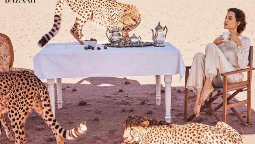 Recent, Angeline Jolie a fost protagonsita unei ședințe foto excepționale, în mijlocul naturii. O provocare pe care actrița a acceptat-o pentru coperta aniversară a revistei Harper’s Bazaar nu putea fi realizată decât pe tărâmuri îndepărtate, dar foarte speciale pentru Jolie, alături de animalele din deșert.