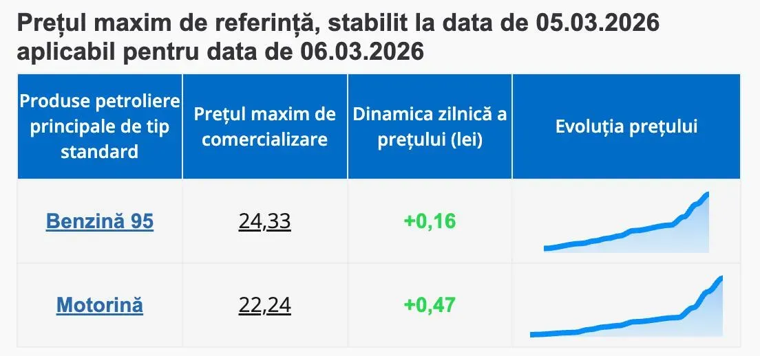 Prețul unui litru de benzină A95 nu trebuie să depășească 24,33 lei, iar cel pentru un litru de motorină - 22,24 lei.