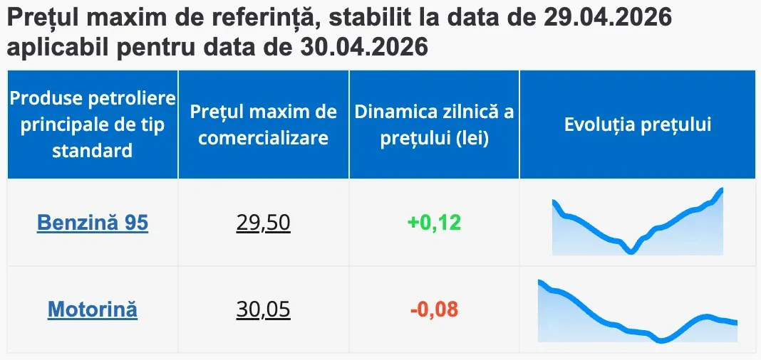 Astfel, prețul unui litru de benzină A95 nu trebuie să depășească 29,50 lei, iar cel pentru un litru de motorină – 30,05 lei.