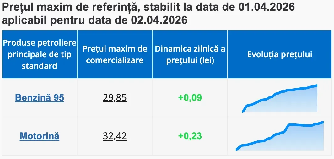 Agenția Națională pentru Reglementare în Energetică (ANRE) a publicat prețurile maxime de referință la principalele produse petroliere, valabile pentru ziua de mâine. Astfel, un litru de benzină A95 nu trebuie să depășească 29,85 lei, iar un litru de motorină – 32,42 lei, potrivit datelor publicate de ANRE.
