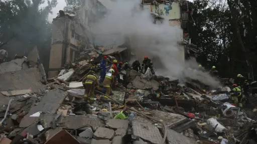 Președintele Ucrainei, Volodimir Zelenski, a anunțat că mai multe persoane au rămas prinse sub dărâmături în Sviatoșinskii și a publicat imagini video de la fața locului. Echipajele de salvare au fost mobilizate de urgență.