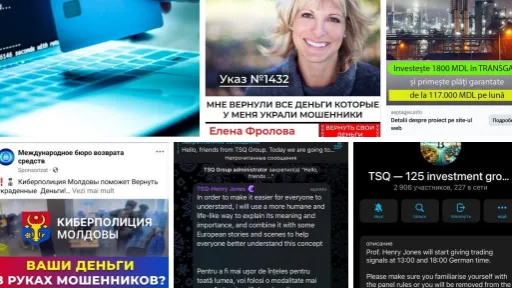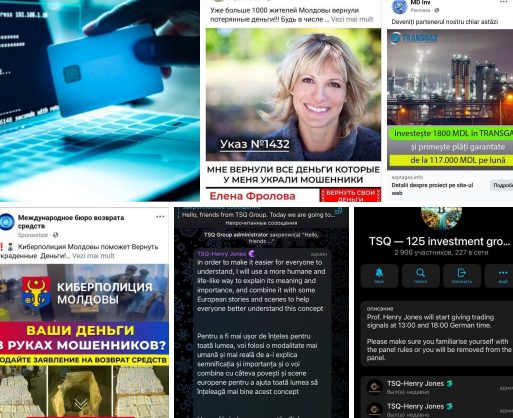 La fel, în vederea atragerii interesului persoanelor de a investi în platformele fantomă, infractorii răspândesc pe rețelele de socializare, în mod special “Facebook” și ”Instagram”, clipuri video create cu ajutorul inteligenței artificiale, folosind secvențe audio, foto și video trucate, ale demnitarilor de stat, politicienilor, sau persoanelor cunoscute publicului larg. De menționat că, aceleași grupări deseori apelează victimele prezentându-se drept avocați sau juriști, comunicându-le că îi pot ajuta în restituirea banilor pierduți, fapte care nu corespund adevărului.