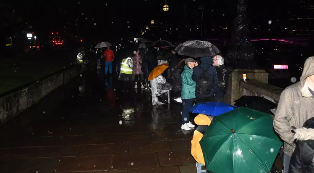 Ca să treacă de noaptea ploioasă londoneză, unii și-au instalat corturi pe malurile Tamisei, însă cei mai mulți au venit pregătiți doar cu umbrele. O femeie și tatăl ei în vârstă de 85 de ani au petrecut noaptea pe scaune de camping, folosind un cearșaf pe post de prelată, care nu le-a fost de mare ajutor.