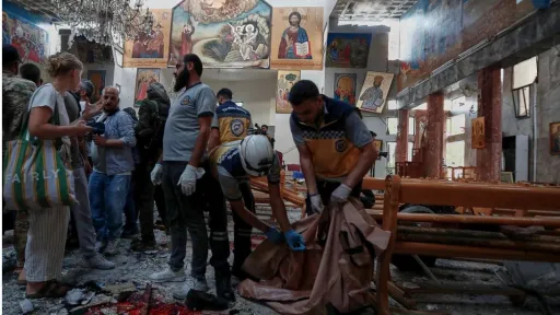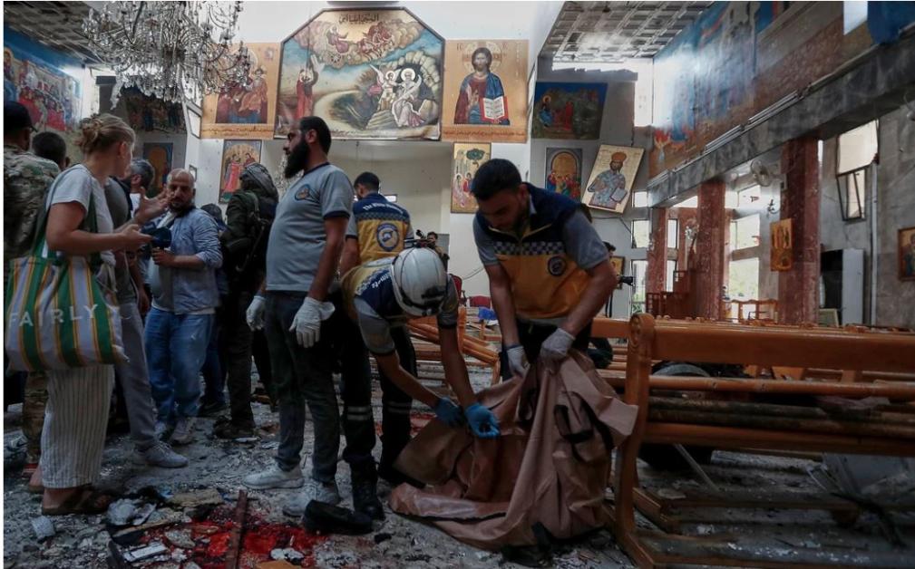 O transmisiune în direct de la faţa locului realizată de apărarea civilă siriană, Căştile Albe, a arătat scene de distrugere din interiorul bisericii, inclusiv podea plină de sânge şi bănci şi zidărie sparte.