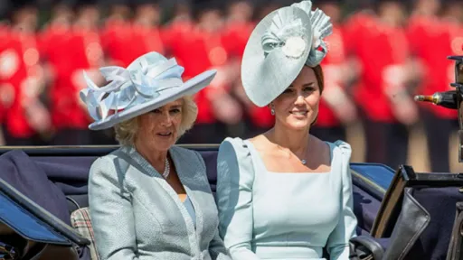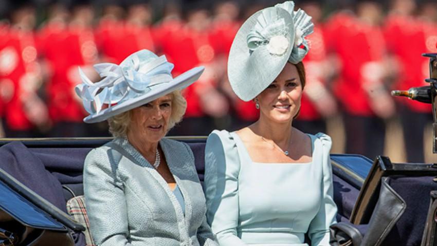 Dacă pentru Harry este deja o tradiție să ia parte la sărbătorirea bunicii sale, pentru Meghan a fost o zi plină de însemnătate. Meghan a sosit într-o caleașcă, alături de soțul ei, și pentru această ocazie specială, a îmbrăcat o ținută de culoarea persicii și o pălărie extrem de stilată.Pe de altă parte, Kate Middleton a strălucit într-o rochie albastru-pastel, la ,,Trooping the Colour”. Dacă Prințul William a participat la paradă călare, așa cum face în fiecare an, soția sa, Kate, a sosit într-o caleașcă, alături de soacra sa, Ducesa de Cornwall. Kate a purtat o ținută mai puțin epatantă decât cea a lui Meghan. Ducesa de Cambridge a îmbrăcată cu această ocazie o rochie ”blue pastel”, în onoarea noului născut, Prințul Louis. Ea a ales o rochie cu umerii supradimensionați, spre deosebire de Meghan, și a mizat pe efectul unei pălării sofisticate, semnate de Juliette Botterill. Ținuta îmbrăcată de Kate, anul acesta, la Trooping The Colour a fost semnată de unul dintre designerii ei favoriți, Alexander McQueen. Ducesa de Cornwall a ales să poarte un outfit într-o nuanță destul de asemănătoare cu cea purtată de Kate. Desigur, outfitul ei a fost unul mai conservator, potrivit pentru vârsta soției Prințului Charles.sursa