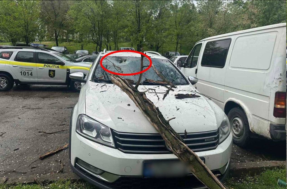 Mai multe crengi și copaci au căzut pe trotuare și în curțile blocurilor din Chișinău. Poliția a înregistrat cinci cazuri în care mașinile parcate în curțile blocurilor au fost distruse.