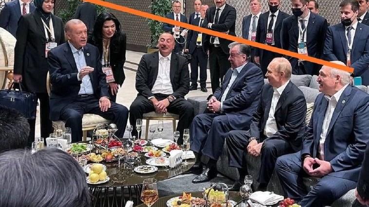 Imaginea arată că președintele Turciei, Recep Tayyip Erdogan, stă mai sus decât toți ceilalți și le vorbește. Putin a fost inclus în lista celor care pur și simplu ascultă de jos. Liderul din Belarus, Aleksandr Lukașenko, a fost și mai jos.