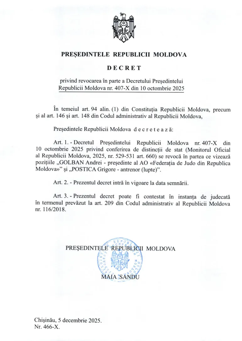Președinta Republicii Moldova, Maia Sandu, a semnat vineri, 5 decembrie, un decret prin care revocă decizia de conferire a distincțiilor de stat pentru două persoane din domeniul sportului: Andrei Golban, președintele Asociației Obștești „Federația de Judo din Republica Moldova”, și Grigore Postică, antrenor de lupte.