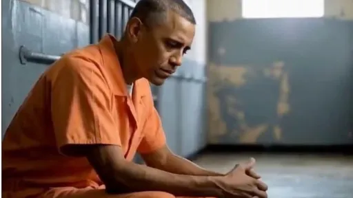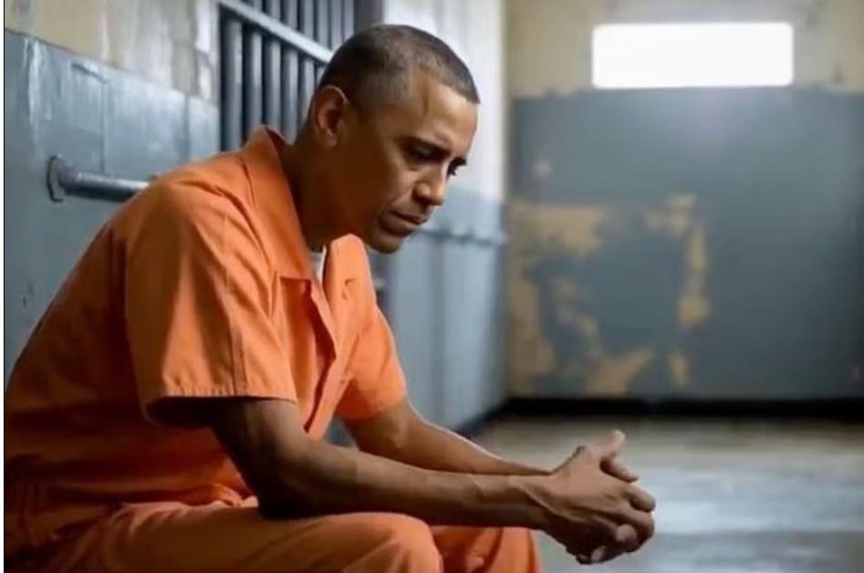 Imagine generată cu ajutorul inteligenței artificiale, în care Obama este arestat și încarcerat, purtând o salopetă portocalie, pe care Trump a postat-o pe Truth Social în weekend.