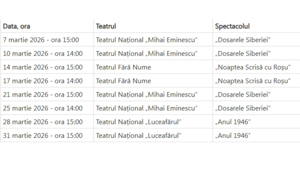Pe scena Teatrului Național „Mihai Eminescu” va fi prezentat spectacolul „Dosarele Siberiei” pe 7, 10, 21 și 25 martie. La „Teatrul Fără Nume” sunt programate reprezentațiile „Noaptea Scrisă cu Roșu” pe 14 și 17 martie, iar Teatrul Național „Luceafărul” va găzdui spectacolul „Anul 1946” pe 28 și 31 martie. Potrivit secretarei de stat a MEC, Valentina Olaru, activitățile urmăresc comemorarea eroilor, consolidarea valorilor civice și promovarea memoriei istorice în rândul elevilor.