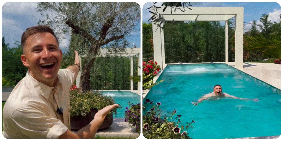 „Gata, am dat start sezonul de scăldat. Am zis, nu mă bag în bazin până nu văd cascada pornită. Nimeni nu are așa ceva. Această cascadă am văzut-o în Bali și am zis că o vreau și la mine acasă”, a menționat actorul, după care a sărit cu tot cu haine în apă.