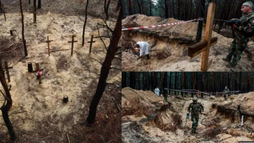 În pădurea din Izium, devenită cimitir, au început exhumările. Kievul afirmă că aproximativ 450 de cadavre au fost îngropate acolo, identitatea unor persoane fiind stabilită după crucile instalate de alți localnici.