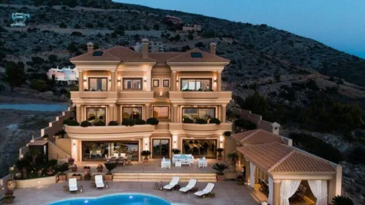 Proprietatea impresionantă are o suprafață construită de 1.390 metri pătrați, amplasată pe un teren de 1.250 mp, și poate găzdui până la 16 oaspeți în cele 8 dormitoare, fiecare cu baie proprie. Vila dispune de toate facilitățile de top: piscină infinită cu vedere la mare, sală de sport complet utilată, hamam, lift interior și o cramă high-end cu băuturi rare.