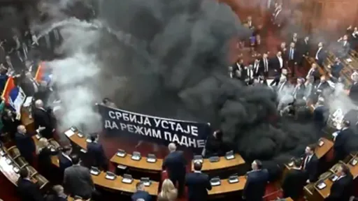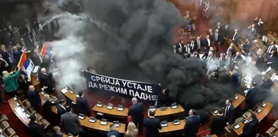 Președinta Adunării Serbiei, care se afla la microfon, nu și-a mai putut continua discursul, sala fiind învăluită în fum. De altfel dezbaterile au fost suspendate, iar imaginile din Parlament arată o scenă de dezordine totală.