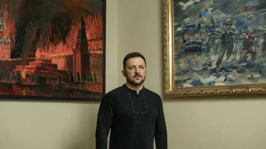 Potrivit revistei Time, lucrarea se află într-o încăpere situată în spatele biroului său și a fost vizibilă și în mesajul lui Zelenski de Anul Nou, transmis pe 31 decembrie 2023.