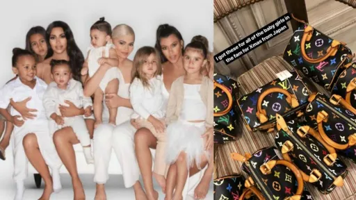 Kim a dezvăluit că a cumpărat genți Louis Vuitton Speedy Mini pentru fiicele sale, North (5 ani) și Chicago (11 luni), dar și pentru nepoțelele Penelope (6 ani), Dream (2 ani), Stormi (11 luni) și True (8 luni).În total, Kim Kardashian a cumpărat opt gentuțe, explicând faptul că ”am păstrat una pentru mine și alta pentru viitor”, după ce un fan a întrebat-o ce face cu gențile în plus. Cadourile au costat în jur de 7.000 de euro. La scurt timp după, Kylie Jenner a postat un video cu Stormi în timp ce primea cadoul de la mătușa ei, Kim. În clip, fetița îmbrățișează geanta și apoi o aruncă pe umăr, demonstrând că este o adevărată fashionista.