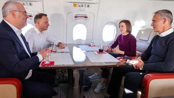 Șefa statului a publicat pe contul său de Instagram o fotografie în care apare alături de președinții Estoniei, Alar Karis, Poloniei, Andrzej Duda, și secretarul general al NATO, Jens Stoltenberg, în același avion care se îndreaptă spre New York, transmite replicamedia.md.