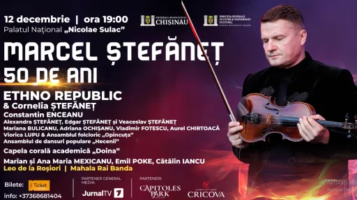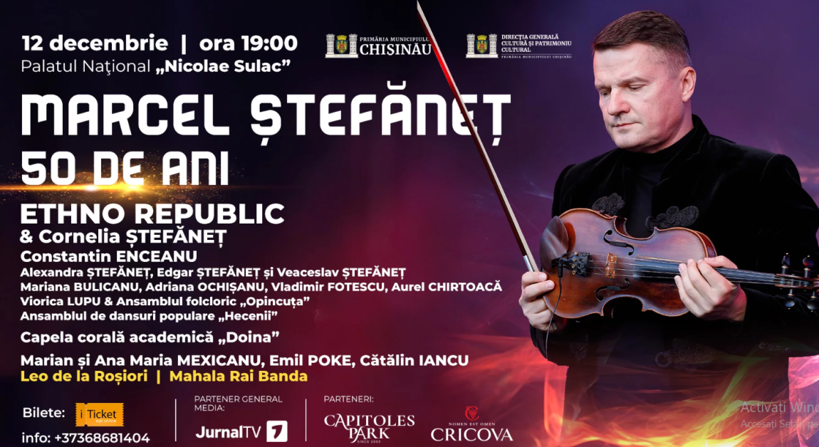 Virtuozul violinist Marcel ȘTEFĂNEȚ invită toți melomanii pasionați de sonoritățile muzicii balcanice la un MEGA CONCERT, dedicat jubileului său de 50 de ani, pe 12 decembrie, ora 19:00, la Palatul Național „Nicolae Sulac” din Chișinău, informează unica.md.