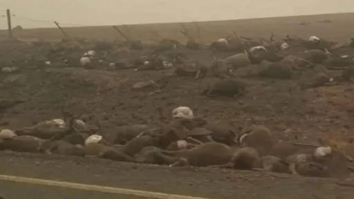Imagini terifiante au fost surprinse pe o şosea din statul New South Wales, una dintre regiunile cele mai afectate de infernul flăcărilor în ultimul weekend. Cadavre de canguri și urși koala sunt împrăștiate pe un câmp din apropierea drumului. Numărul animalelor moarte în incendii ar putea ajunge la 1 miliard, susțin specialiștii.