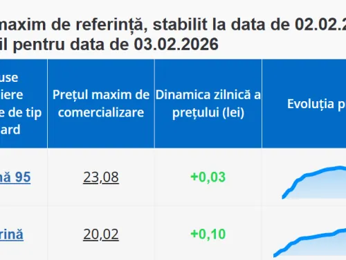 ANRE a publicat noile prețuri plafon la carburanți pentru marți, 3 februarie. Potrivit datelor afișate, benzina se scumpește ușor, iar motorina are o creștere mai pronunțată față de ziua de astăzi.