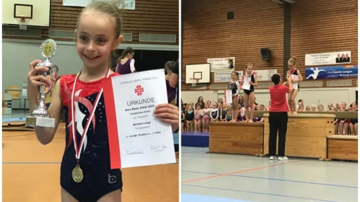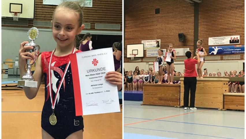 Aici, în Germania, Adriana a început să facă gimnastică, iar după un an de antrenamente, au apărut primele rezultate frumoase.Fetița a obținut locul 1 la un turneu de gimnastică în Germania, relatează jurnalista Elena Robu. Adriana s-a clsat pe locul întâi în cadrul turneului de gimnastică pentru copiii începători din zona Frankfurt. Competiția a fost destul de dură, la ea participând aproximativ 200 de fetițe.