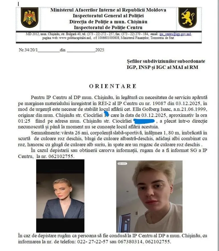 O tânără pe nume Ella Golberg Isaac, în vârstă de 26 de ani, a dispărut în noaptea de 3 decembrie, în jurul orei 01:25, după ce a părăsit locuința situată pe strada Ciocârliei, în cartierul Telecentru din Chișinău. De atunci, rudele nu mai au nicio veste despre ea.
