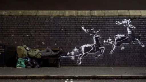 Cea mai recentă creaţie a artistului britanic, a cărui identitate rămâne învăluită în mister, înfăţişează doi reni desenaţi pe un zid din cărămidă părând că trag după ei, asemenea saniei lui Moş Crăciun, o bancă de pe Vyse Street, situată în Jewellery Quarter, relatează Agerpres.Un videoclip publicat de artist pe pagina sa de Instagram înfăţişează un bărbat cu barbă albă, cu înfăţişarea unei persoane fără adăpost, care bea dintr-o sticlă şi întinzându-se apoi pe bancă în timp ce câteva persoane trec prin dreptul său.