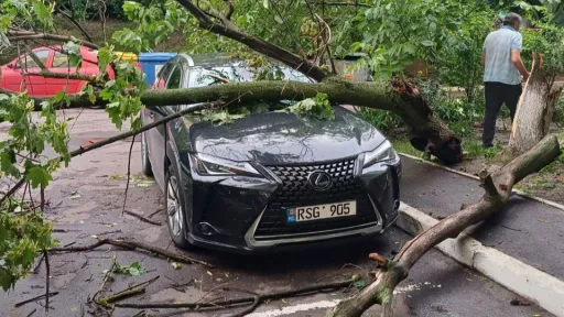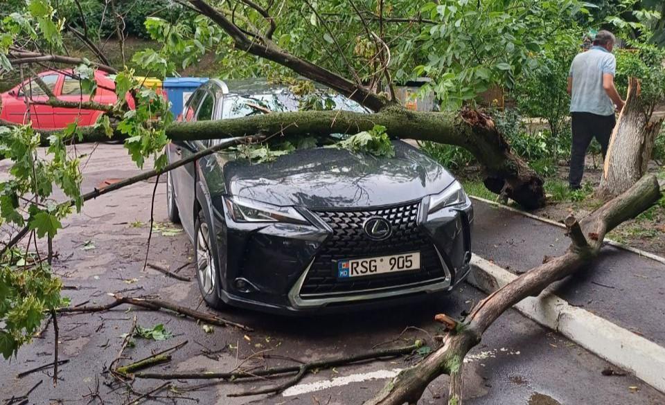Două automobile, parcate în apropierea arborilor, au avut de suferit - îngreunate de ploaie crengile arborilor s-au frânt.