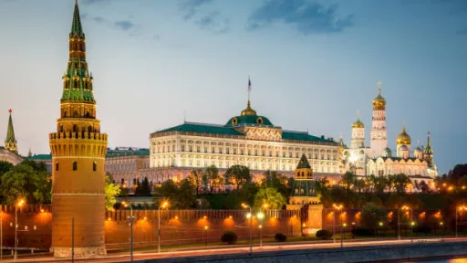 Beautiful illuminated famous Kremlin in Moscow at Twilight - Night. The official residence of the president of the Russian Federation. Moscow, Russia.