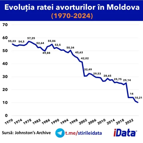 Rata avorturilor în Republica Moldova a scăzut semnificativ în ultimele cinci decenii, atingând în 2024 unul dintre cele mai mici niveluri din istoria recentă a țării. Potrivit unei analize realizate de iData pe baza arhivei Johnston’s Archive, dacă în 1970 se raportau 55–60 de avorturi la 1.000 de femei, în prezent indicatorul a ajuns la doar 10 avorturi la 1.000 de femei.