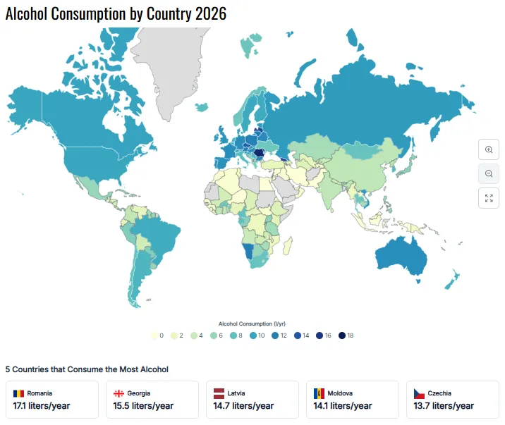 Republica Moldova se află în topul mondial al țărilor cu cel mai ridicat consum de alcool pe cap de locuitor, potrivit datelor World Population Review. Țara ocupă locul patru la nivel global, cu un consum estimat la 14,1 litri de alcool pur per adult pe an, fiind depășită doar de România, Georgia și Letonia.
