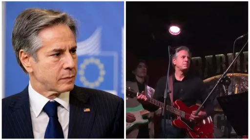 Secretarul de stat al SUA, Antony Blinken, a cântat o interpretare a piesei "Rockin' in the Free World" a lui Neil Young, alături de o trupă locală, într-un bar numit Diktat, în timpul călătoriei sale surpriză la Kiev.