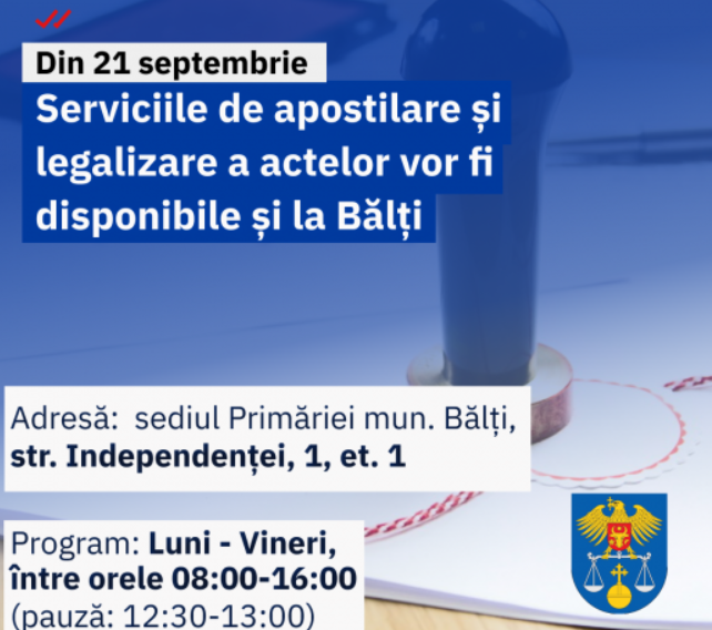 Ministerul Justiției a deschis un nou ghișeu al Direcției apostilă și legalizare, în municipiul Bălți. Astfel, cetățenii vor avea posibilitatea să depună documentele spre apostilare și legalizare la ghișeul din Bălți și să le ridice, la data indicată, tot de acolo. Serviciul este disponibil începând de astăzi, 21 septembrie, scrie TV8.md.