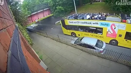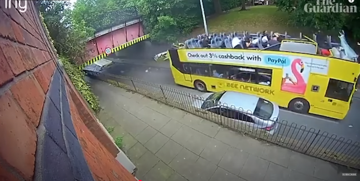Imaginile video postate pe internet surprind momentul în care autobuzul lovește cu forță podul, iar acoperișul de deasupra se desprinde, provocând haos în interiorul vehiculului.