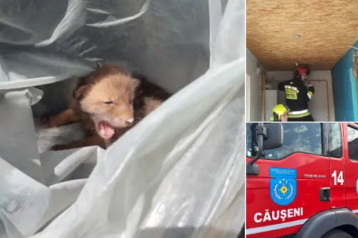 Imagine 17/04/2025 -10:13 News Un pui de vulpe, blocat în podul unei case din satul Ursoaia, salvat de echipa IGSU